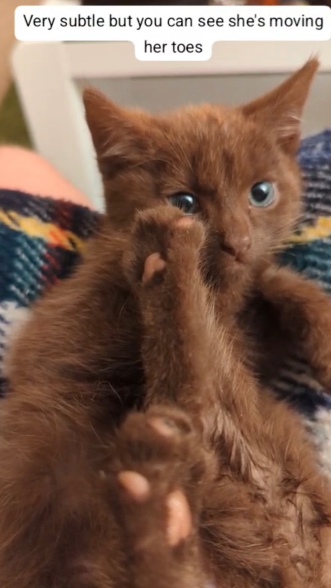Beatrix is no older than 12 weeks and was found dumped in a box behind a nursery with her siblings. She was unable to run when approached, unlike her siblings who made a run for it, as she could not use her back legs. We have set some traps in hopes of catching them too. Understandably they were all terrified and we can only speculate what their life has been like so far.